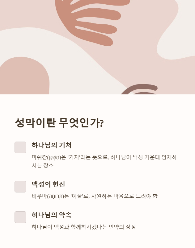 - 성막은 하나님께서 백성 가운데 거하시겠다는 약속의 상징입니다.