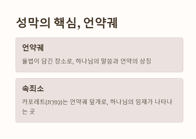 - 'כַּפֹּרֶת' (카포레트) – ‘속죄소’, 언약궤 덮개로서 하나님의 임재가 나타나는 곳.