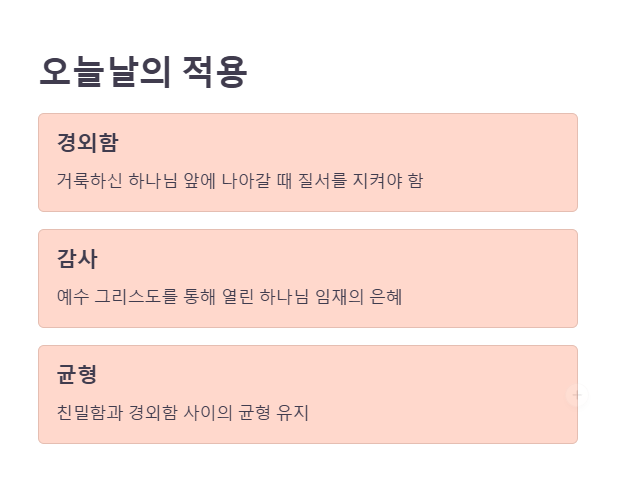 우리는 거룩하신 하나님 앞에 나아갈 때 여전히 경외함과 질서를 지켜야 합니다. 동시에, 예수 그리스도를 통해 더 이상 막힘 없는 임재의 은혜를 누릴 수 있다는 사실에 감사와 찬양으로 반응해야 합니다.