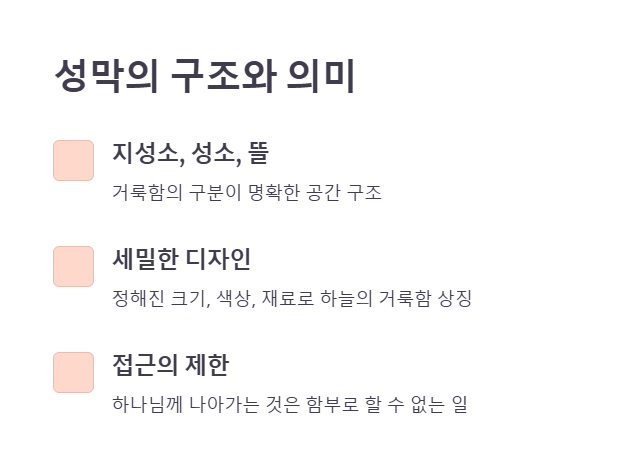• 성막은 **지성소(하나님의 임재), 성소(제사장 출입), 뜰(백성이 접근 가능)**로 나뉘며, 거룩함의 구분이 명확합니다.