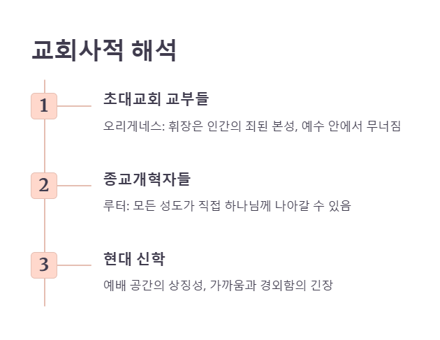 • 오리게네스는 휘장을 인간의 죄된 본성과 연결 지으며, 예수 안에서 그 벽이 무너졌다고 보았습니다.