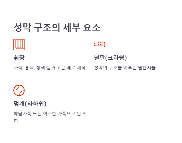 • 휘장은 자색, 홍색, 청색 실과 고운 베 실로 만들어지고, 그룹이 수놓아집니다. 이는 하늘의 거룩함을 시각적으로 상징합니다.