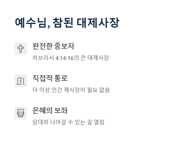 • 예수님은 히브리서 4장과 9장에서 참된 대제사장으로 묘사되며, 더 이상 인간 제사장이 아닌 예수님을 통해 하나님께 나아가게 되었습니다.