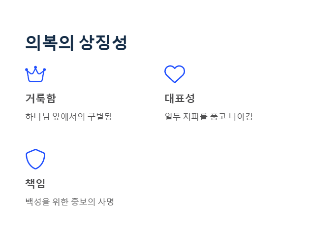 • 제사장의 의복은 거룩과 구별됨을 시각적으로 표현하며, 제사장의 책임과 신성한 사명을 나타냅니다.