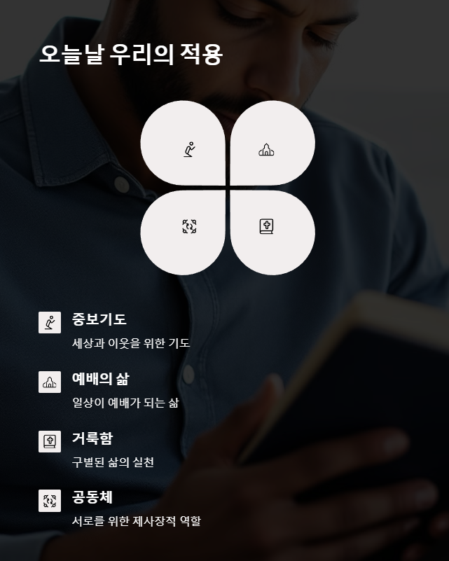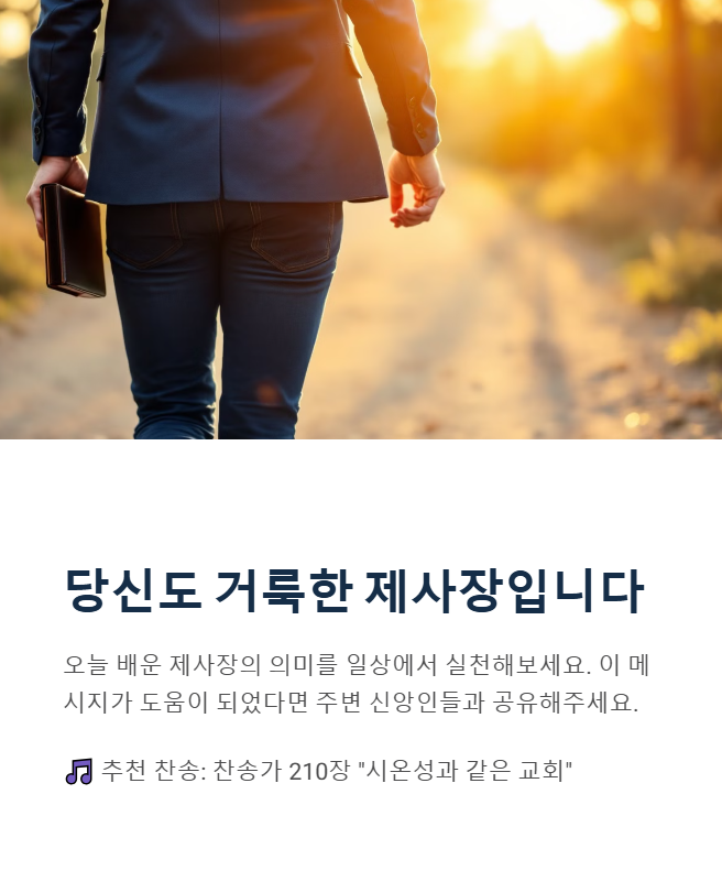 • 신약은 모든 신자를 **‘왕 같은 제사장’(벧전 2:9)**이라 칭하며, 각자가 하나님 앞에서 중보와 예배의 책임을 가진 존재임을 선언합니다.