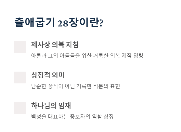출애굽기 28장은 아론과 그의 아들들을 제사장으로 세우기 위해 하나님께서 명하신 제사장 의복의 상세한 지침을 담고 있습니다. 이 옷들은 단순한 장식이 아니라 거룩한 직분을 위한 상징적인 표현이며, 하나님의 임재와 백성의 대표성을 담고 있는 도구입니다.