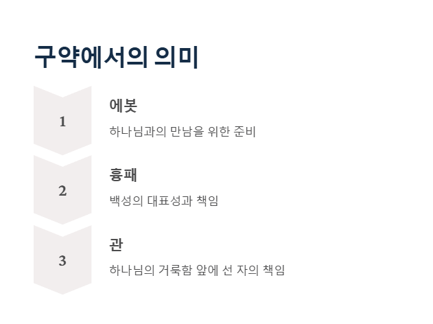 • 에봇은 하나님과의 만남을 위한 준비, 흉패는 백성의 대표성, 관은 하나님의 거룩함 앞에 선 자의 책임을 상징합니다.