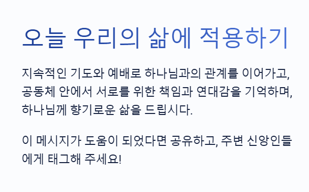 우리는 기도와 예배를 통해 하나님과의 관계를 지속적으로 이어가야 합니다. 또한, 공동체 안에서 서로를 위한 책임과 연대감을 기억하고, 하나님께 드리는 삶이 향기롭고 거룩하게 유지되어야 합니다.
