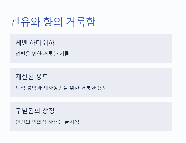 • 관유와 향은 오직 성막과 제사장만을 위한 거룩한 용도로 제한되며, 인간의 임의적 사용은 금지됩니다.
