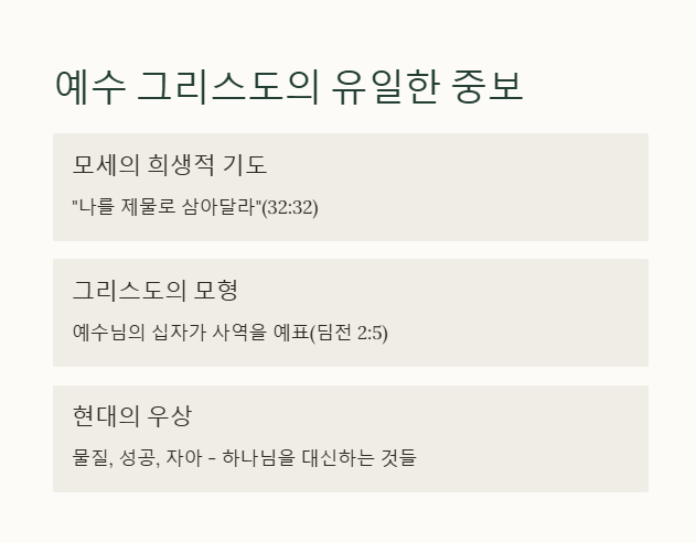 - 이는 예수 그리스도께서 우리 죄를 대신하여 십자가에 달리신 사역의 모형으로 해석됩니다(디모데전서 2:5).