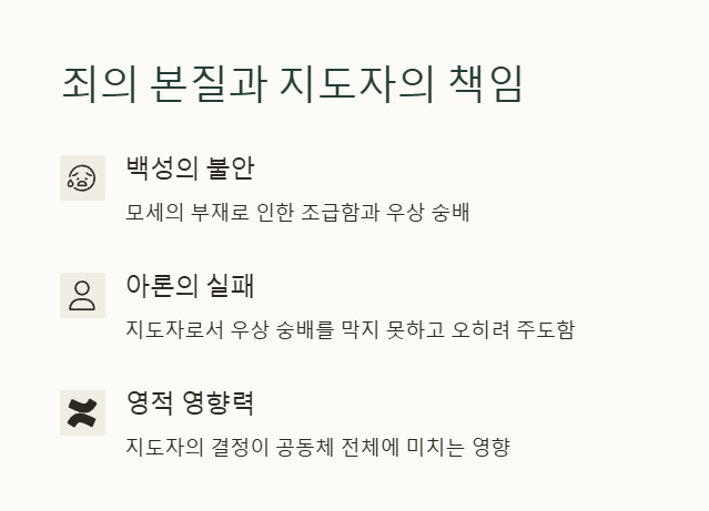 - 아론은 지도자로서 단호하게 우상 숭배를 막지 못하고, 오히려 그 일을 주도합니다.
