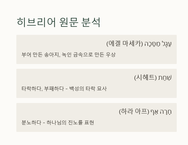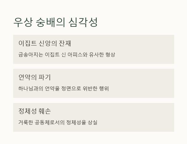 - 금송아지는 이집트 신 아피스의 형상과 유사하여, 이스라엘이 구원받은 직후 이방의 방식을 따라간 것입니다.