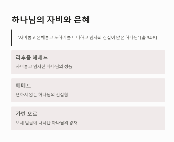 - 하나님은 **“자비롭고 은혜롭고 노하기를 더디하고 인자와 진실이 많은 하나님”(34:6)**으로 자신을 계시하십니다.