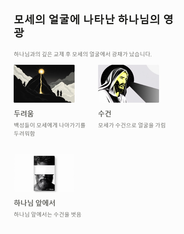 - 모세는 하나님의 영광을 본 후 얼굴에서 광채가 났으며, 사람들은 그 앞에 나아가기를 두려워했습니다.