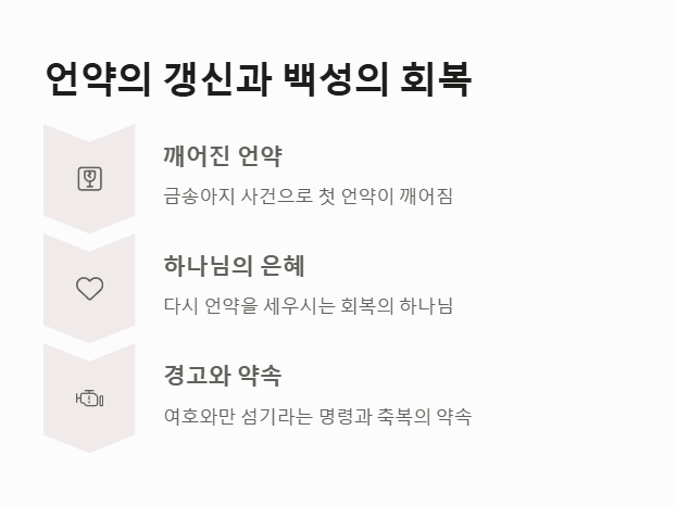 - 첫 번째 언약이 깨어졌지만, 하나님은 다시 언약을 세우십니다. 이는 회복의 하나님, 은혜의 하나님을 보여줍니다.