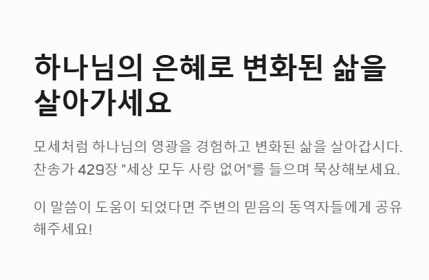 우리는 넘어졌을지라도, 하나님은 다시 시작하게 하시는 은혜의 하나님이심을 믿어야 합니다. 하나님의 임재를 경험한 사람은 변화된 삶으로 그 빛을 드러냅니다. 우리도 모세처럼 하나님의 영광을 갈망하며, 주의 말씀에 붙들린 삶을 살아야 합니다.