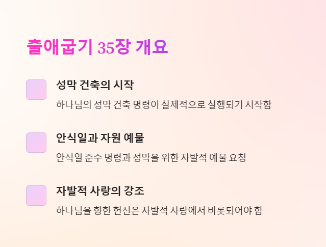출애굽기 35장은 하나님께서 주신 성막 건축 명령의 실제적 실행이 시작되는 부분입니다. 모세는 백성들에게 안식일을 먼저 지킬 것을 명령하고, 이후 성막 건축을 위한 자원 예물을 요청합니다. 이 장은 하나님을 향한 헌신이 자발적 사랑에서 비롯되어야 함을 강조합니다.