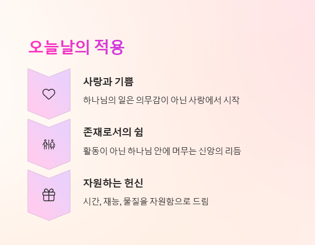 하나님의 일은 억지나 의무감이 아닌 사랑과 기쁨에서 시작되어야 합니다. 또한, 안식은 활동이 아니라 존재로서의 쉼이며, 하나님 안에 머무는 신앙의 리듬을 회복해야 합니다. 우리는 우리의 시간, 재능, 물질을 자원함으로 하나님께 드려야 합니다.