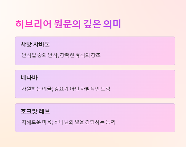 - 'שַׁבָּת שַׁבָּתוֹן' (샤밧 샤바톤) – ‘안식일 중의 안식’, 강력한 휴식의 강조.