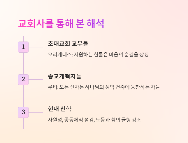 - 현대 신학은 이 본문을 자원성, 공동체적 섬김, 노동과 쉼의 균형이라는 관점에서 해석하며, 하나님 나라 건설에 모든 성도가 참여해야 함을 강조합니다.