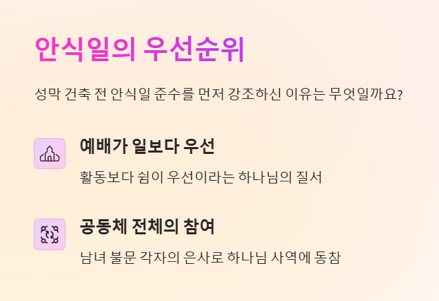 - 이는 일보다 예배, 활동보다 쉼이 우선이라는 하나님의 질서를 보여줍니다.