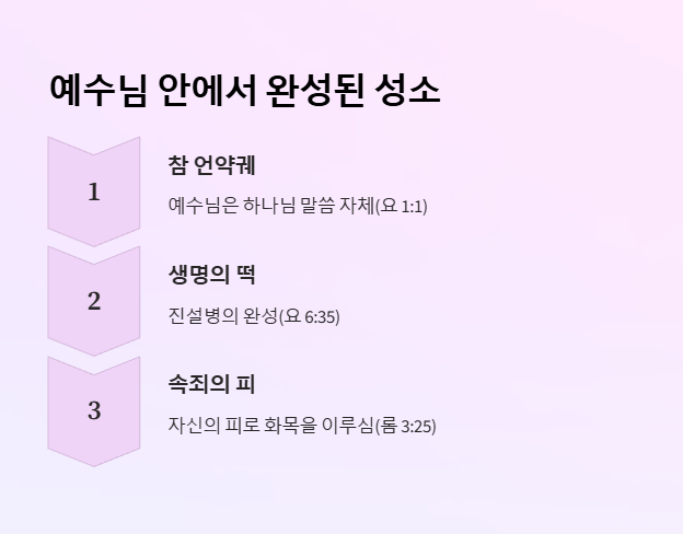 - 예수님은 하나님의 말씀 자체이며(요 1:1), 속죄소에서 흘린 피처럼 자신의 피로 화목을 이루신 분입니다(롬 3:25).