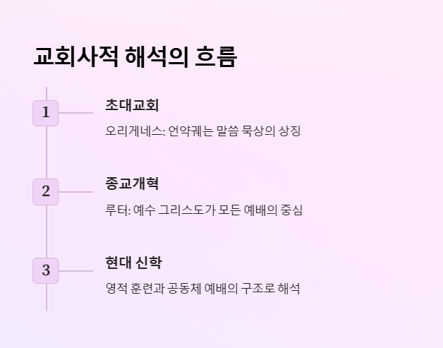 - 오리게네스는 언약궤를 말씀 묵상의 상징으로 해석하며, 등잔대는 성경을 통해 비추는 성령의 조명을 의미한다고 보았습니다.