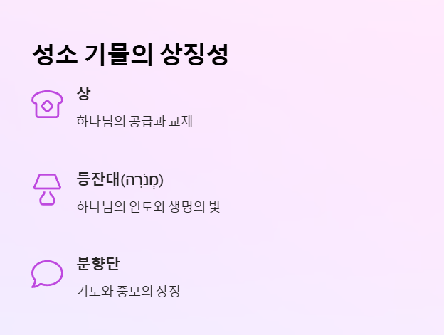 - 현대 신학은 기물의 상징성을 영적 훈련과 공동체 예배의 구조와 연결해 해석하며, 구체적 예배의 요소들이 신자의 삶 전체에 영향을 끼쳐야 함을 강조합니다.