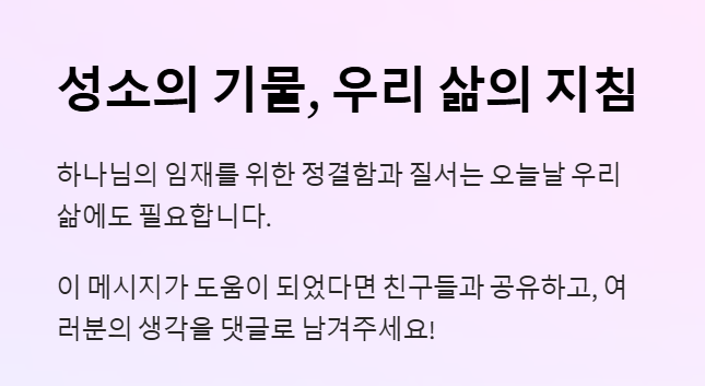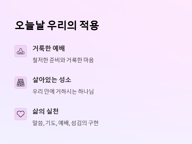 하나님께 드리는 예배는 철저한 준비와 거룩한 마음에서 시작되어야 합니다. 말씀, 기도, 예배, 섬김 등은 모두 삶 속에 실천되어야 할 성소의 기물과 같습니다. 우리는 예수 그리스도 안에서 더 이상 외적인 성막이 아닌, 우리 안에 거하시는 하나님을 모시며 살아가는 성소입니다.