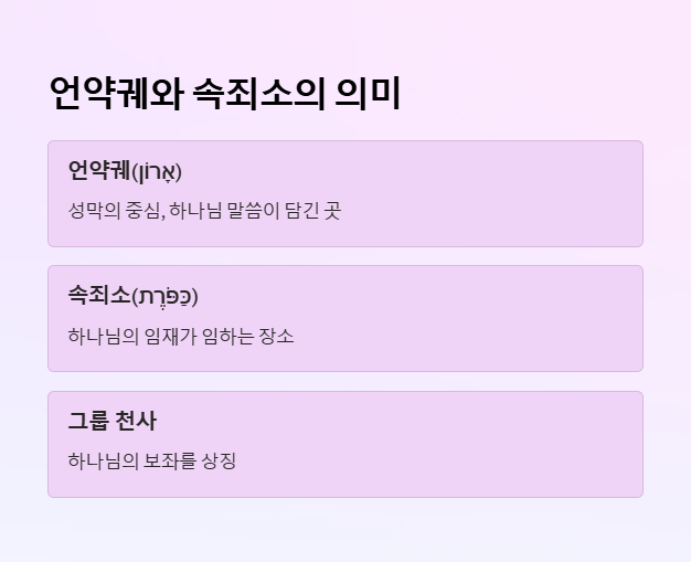 - 언약궤는 성막의 중심이자, 하나님의 말씀(십계명)이 담긴 곳이며, 속죄소는 그 위에 놓여 하나님의 임재가 임하는 장소입니다.