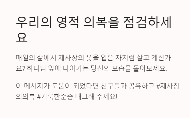 하나님 앞에 나아가는 삶은 단지 마음만이 아니라, 준비된 삶, 거룩한 태도, 정직한 섬김으로 드러나야 합니다. 우리는 매일의 삶을 통해 제사장의 옷을 입은 자처럼, 세상 가운데 거룩한 존재로 살아가야 합니다.