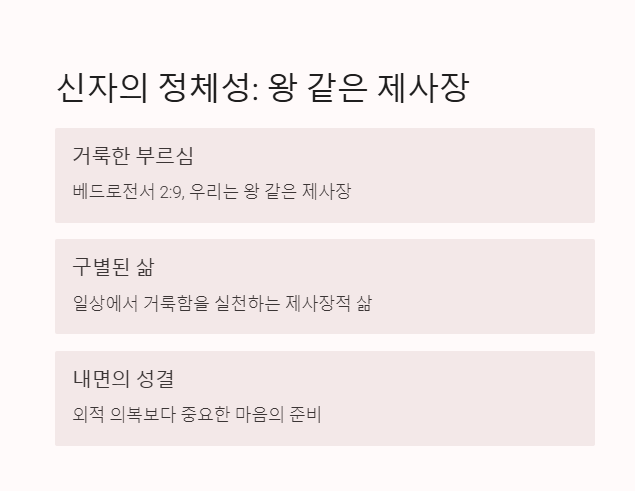 - 신자는 “왕 같은 제사장”으로 부르심을 받았으며(베드로전서 2:9), 거룩한 옷처럼 삶에서도 구별된 모습을 살아야 합니다.