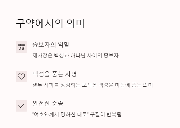 - 제사장은 백성과 하나님 사이에서 중보하는 자로서, 그의 복장 또한 그 사명을 나타내는 상징이 됩니다.