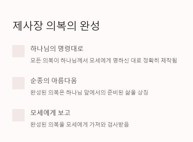 - 모든 작업은 하나님께서 명하신 설계에 따라 정확히 이루어졌으며, 이는 예배와 신앙생활에서 순종의 중요성을 드러냅니다.