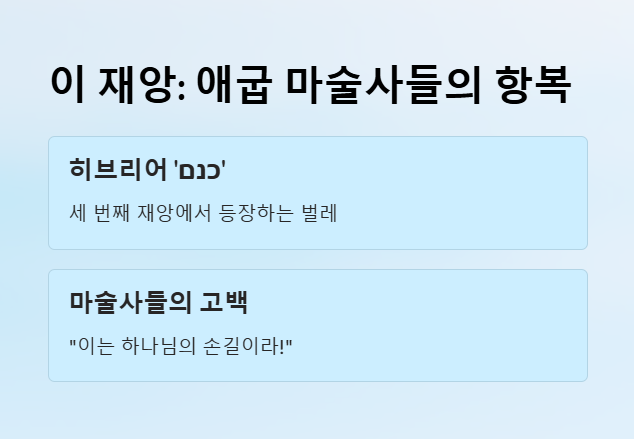• 세 번째 재앙(이 재앙)에서는 애굽의 마술사들이 이를 흉내 내지 못하고, 하나님의 손길임을 인정하게 됩니다.
