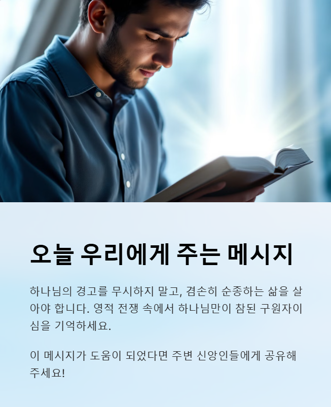 우리는 하나님의 경고를 무시하지 않고, 겸손히 하나님께 순종하는 삶을 살아야 합니다. 또한, 영적 전쟁 속에서 하나님만이 참된 구원자이심을 기억해야 합니다.